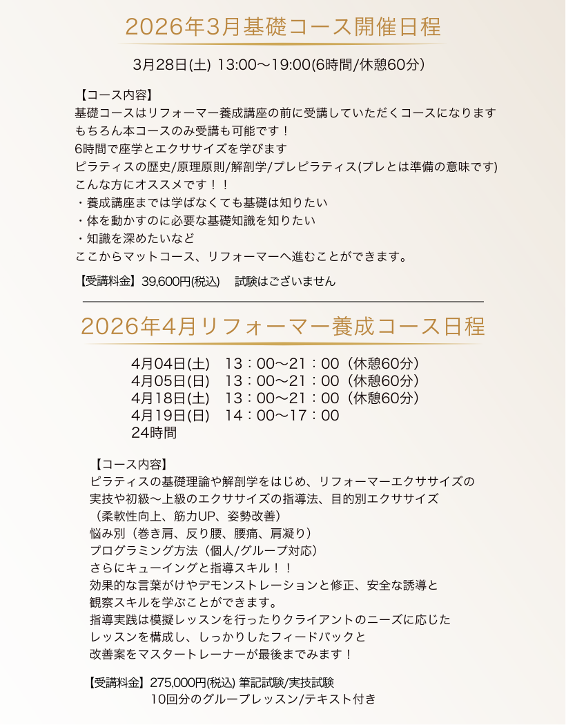 経験豊富で尚且つ技術の確かなインストラクターが所属しております。当スタジオは自社でピラティスアカデミーを運営しており、インストラクターのスキル維持・向上のために、定期的な研修制度があります。お客様に適切なレッスンを受けていただくために、日々技術の向上を目指しています。