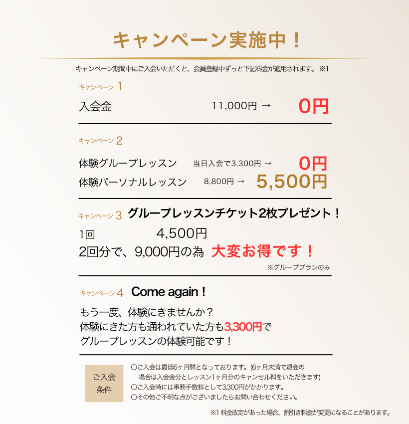 体験当日にご入会いただけますと各種キャンペーンがございます。